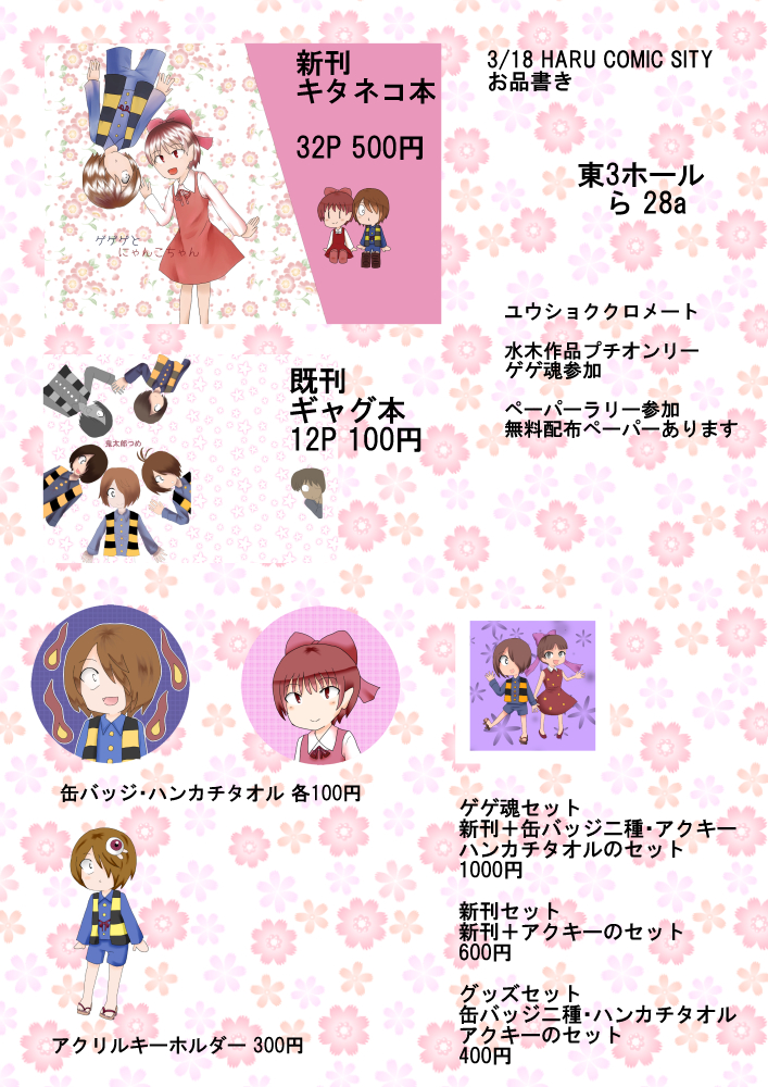 同人・イベント関係 2018/02/25 コミックシティ! ちょうお久しぶりです! 3月18日のシティにサークル参加します! サークルスペースは東3ホールのら28aです 鬼太郎でスペとってます 水木プチオンリーゲゲ魂に参加しています ペーパーラリーも参加しています お品書きはこちらです 今回は鬼太郎以外のグッズ等はないのでご注意ください 当日は会場で私と握手!
